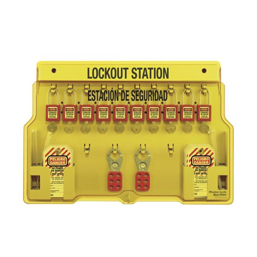 Master Lock 1483BP410ES Lockout Tagout Padlock Station, Spanish/English, features resilient polycarbonate material that provides ultimate heat resistance and mipact strength superior to typical stations. Translucent lockable cover protects contents from dust and prevents missing equipment. One-piece molded construction eliminates loose parts and reinforced snap-on clips provide easy padlock and hasp storage and removal. Station measures 15-1/2 in. (393 mm) tall x 22 in. (558 mm) wide x 1-3/4 in. (44 mm) depth Lockout Station Includes: (10) 410RED Zenex™ thermoplastic safety padlocks, keyed different (2) 420 Lockout tagout safety hasps (2) 497AX Spanish/English laminated”Danger Do Not Operate” safety tag packs (12 tags/pack)