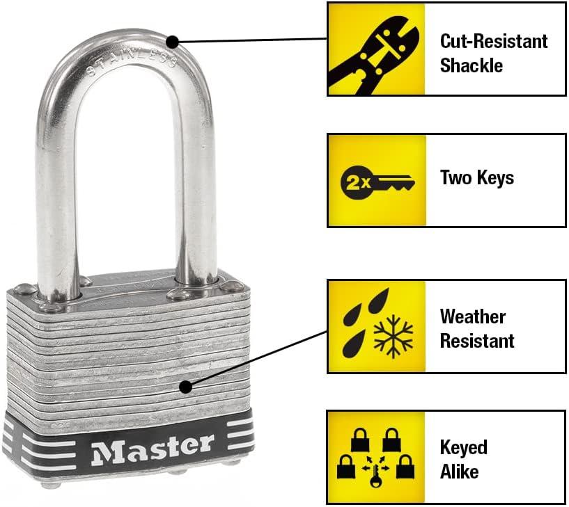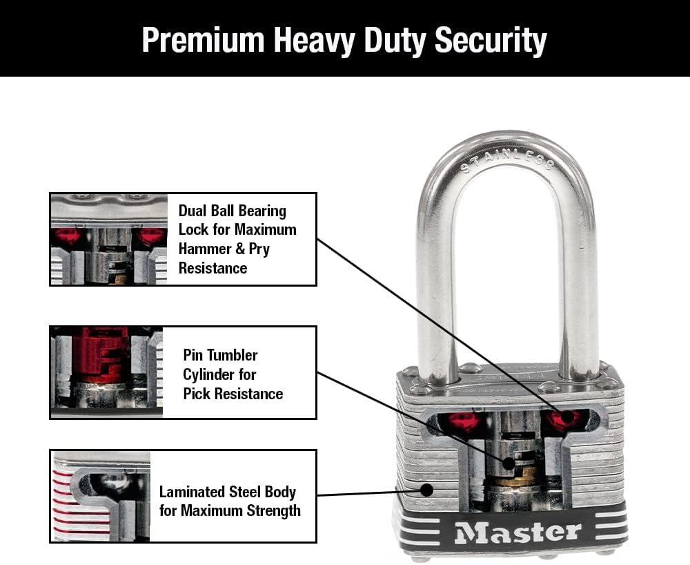 The Master Lock 1SSTLF Stainless Steel Padlocks feature a 1-3/4 in. (44 mm.) wide laminated stainless steel body for maximum strength, reliability, and weather resistance. The 5/16 in. (8 mm.) diameter shackle is 1-1/2 in. (38 mm.) long and made of stainless steel, offering extra resistance to cutting, sawing, and weather. The 4-pin cylinder prevents picking and the dual locking ball bearings provide resistance against prying and hammering. The Lifetime Guarantee provides peace of mind from a brand you know and can trust.