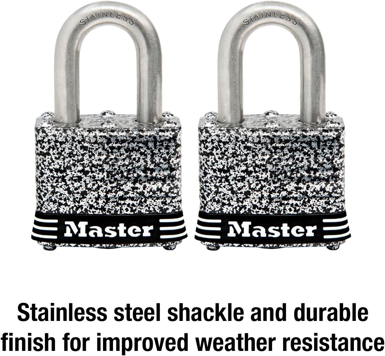 The Master Lock 3SSQ Stainless Steel Padlock with Key features a 1-9/16 in. (40 mm) laminated stainless steel body design, with a tough weather coated finish for maximum strength and reliability. The 9/32 in. (7 mm) diameter shackle is 3/4 in. (19 mm) long and made of stainless steel, offering extra resistance to cutting, sawing, and weather. The 4-pin cylinder prevents picking and the dual locking ball bearings provide resistance against prying and hammering. The Lifetime Guarantee provides peace of mind from a brand you know and can trust.