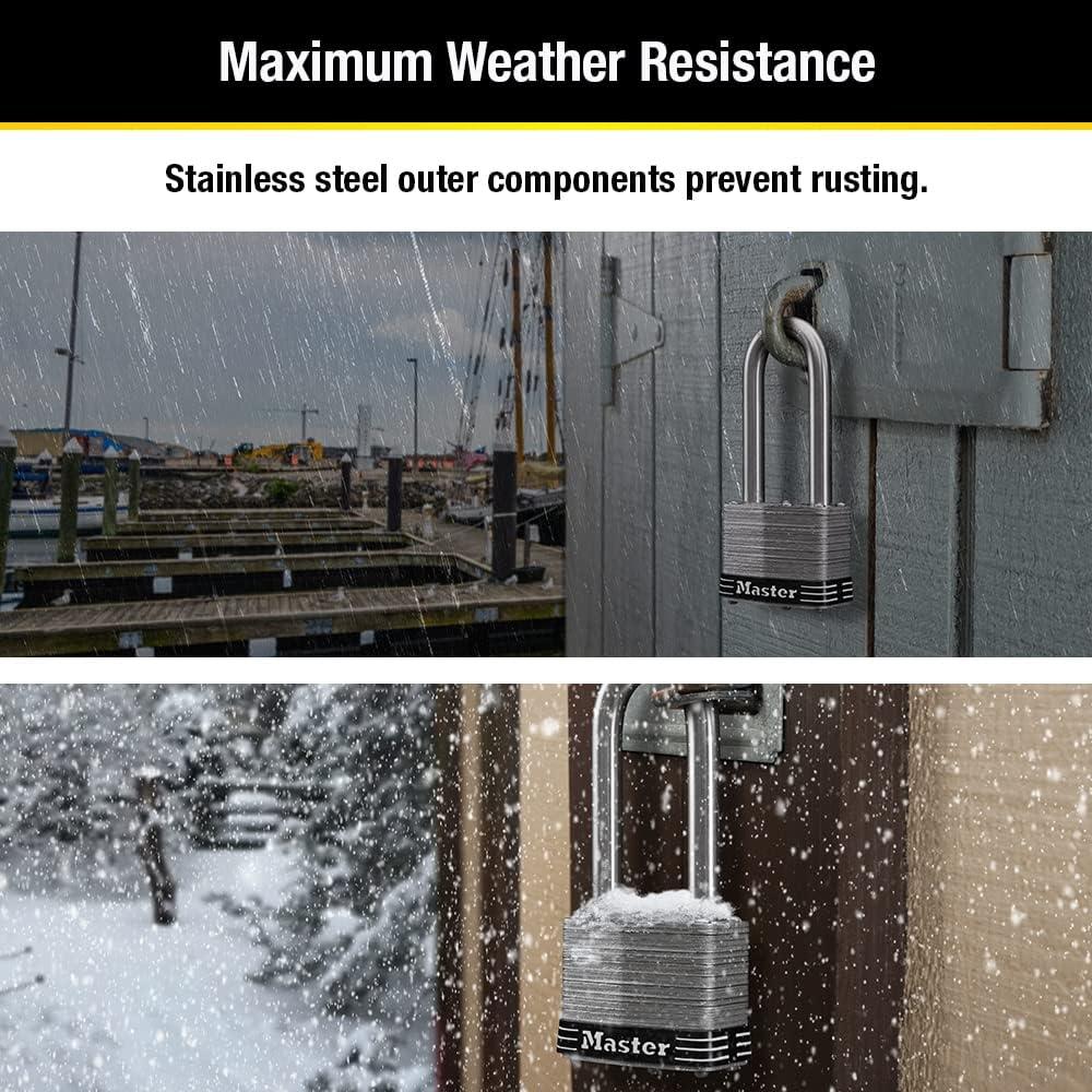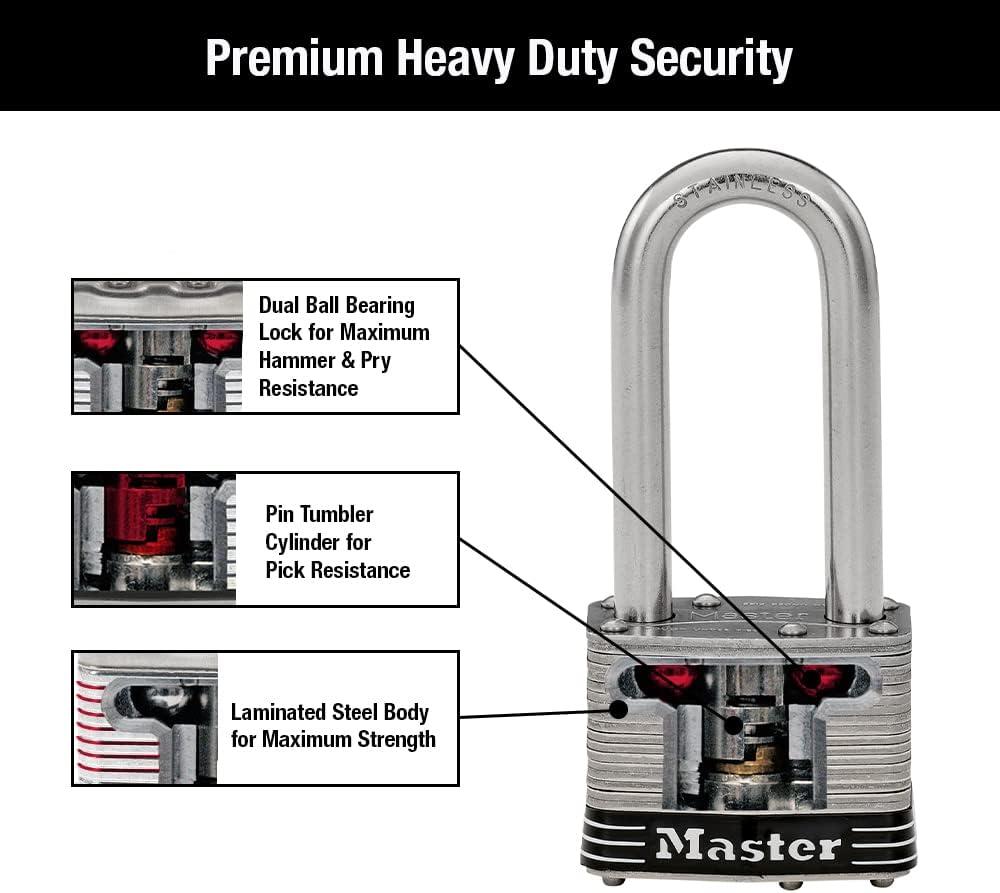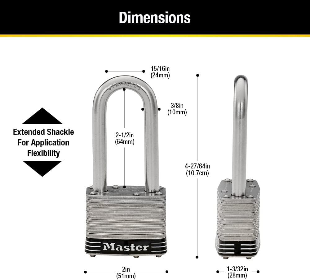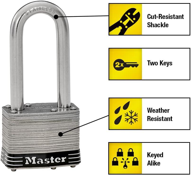 The Master Lock 5SSQLJ Stainless Steel Padlock with Key features a 2 in. (51 mm.) wide laminated stainless steel body for maximum strength, reliability, and weather resistance. The 3/8 in. (10 mm.) diameter shackle is 2-1/2 in. (64 mm.) long and made of stainless steel, offering maximum resistance to cutting, sawing, and weather. The 4-pin cylinder prevents picking and the dual locking ball bearings provide resistance against prying and hammering. The Lifetime Guarantee provides peace of mind from a brand you know and can trust.