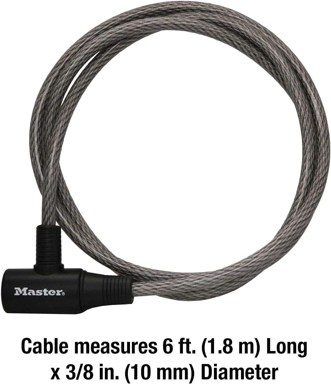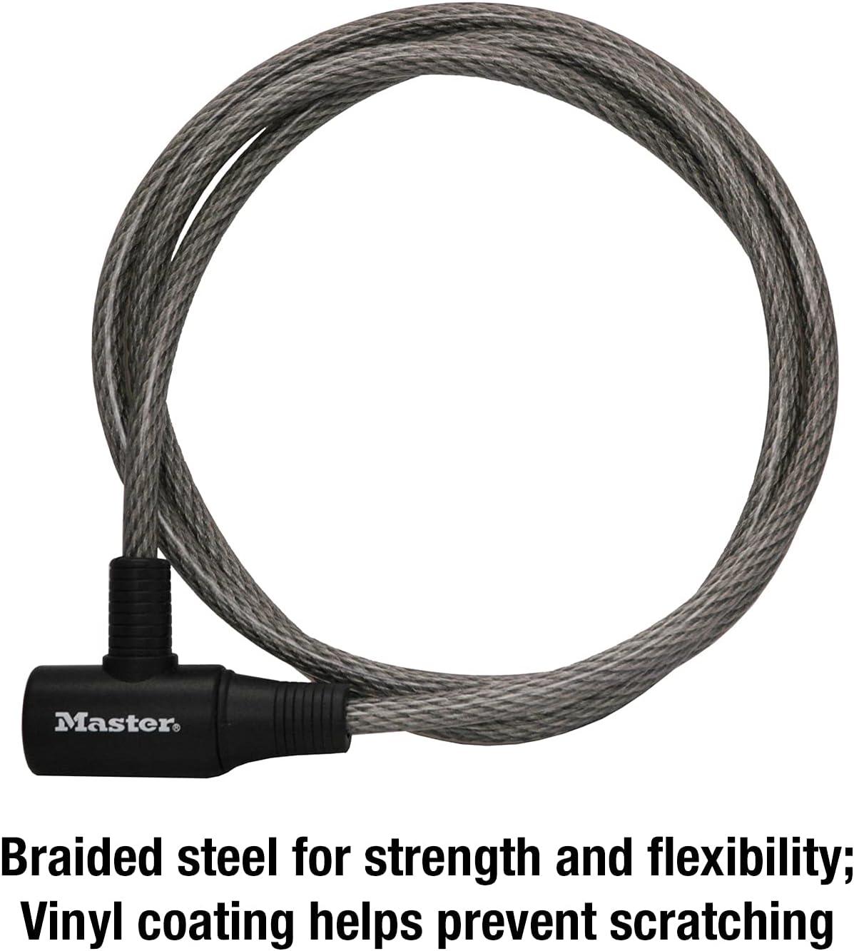 The Master Lock No. 8122D Set Your Own Combination Cable Lock is 6ft (1.8m) long and features a 1/2in (10mm) diameter braided steel for maximum strength and flexibility. The protective vinyl coating protects against scratches. The 4 dial combination security offers keyless convenience. The Limited Lifetime Warranty provides peace of mind from a brand you can trust.