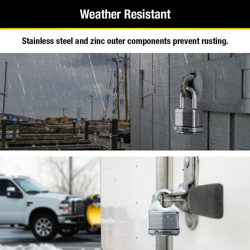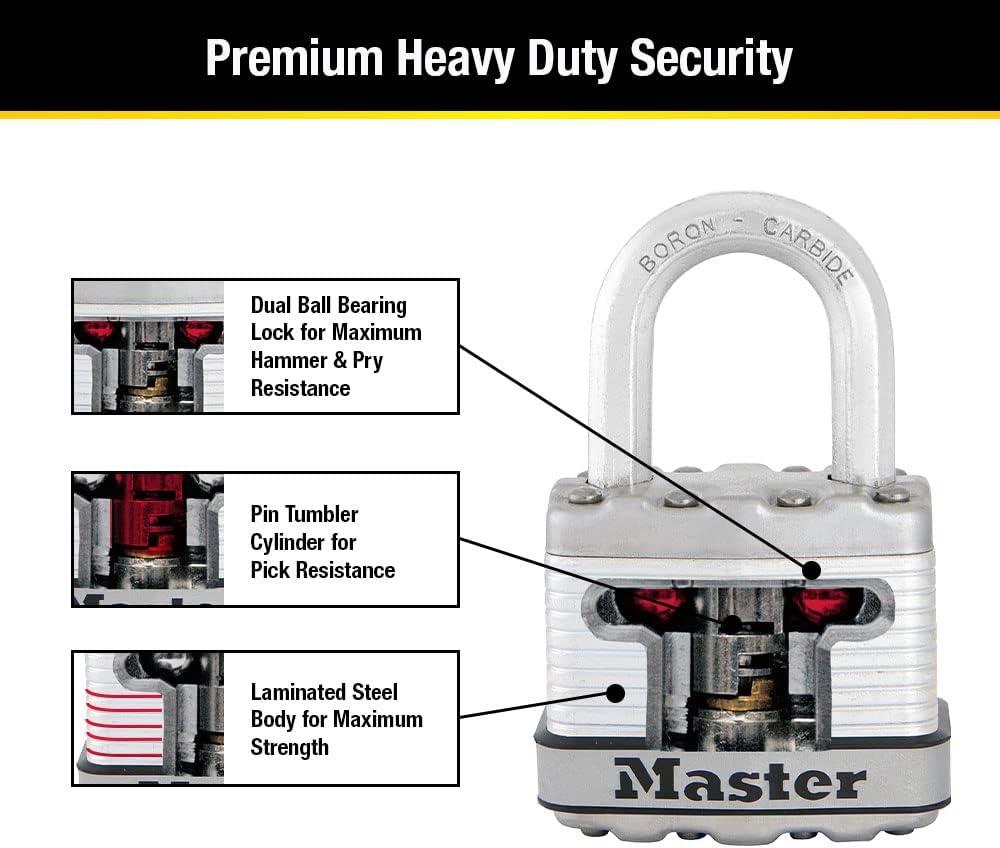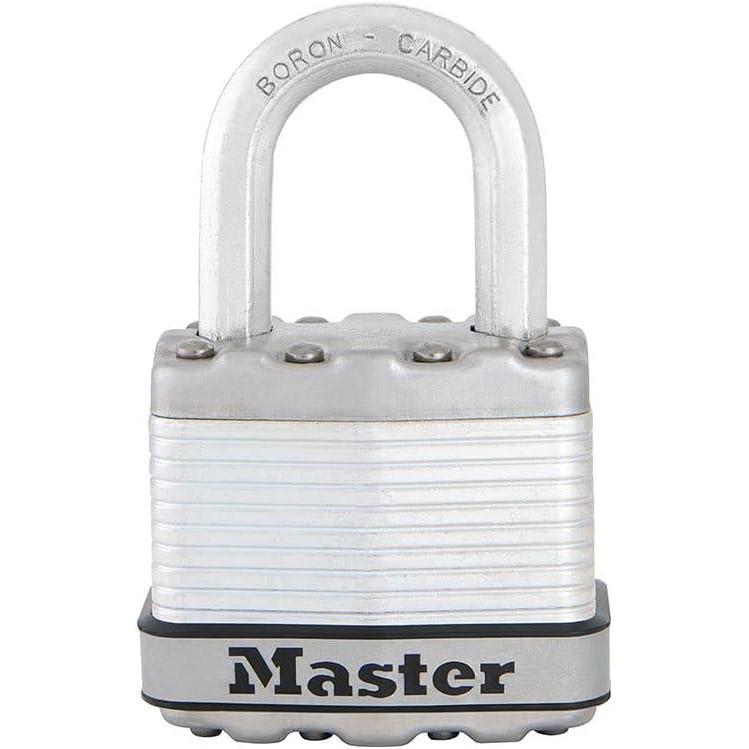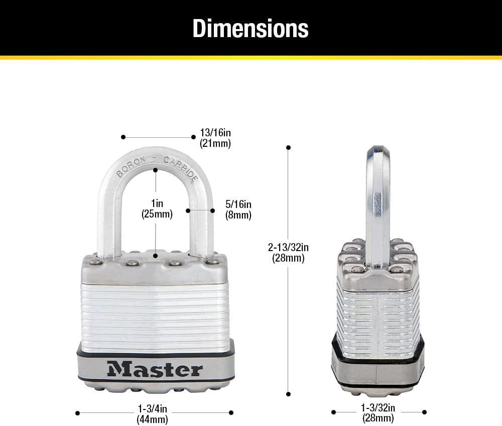 The Master Lock Magnum M1XT Laminated Padlocks with Keys feature a 1-3/4 in. (44 mm) wide laminated steel body for maximum strength and reliability, and is surrounded by stainless steel and zinc outer components for weather resistance. The 5/16 in. (8 mm) diameter octagonal shackle is 1 in. (25 mm) long and made of Tough-Cut boron-carbide, 50% harder than hardened steel, offering maximum resistance to cutting and sawing. The 4-pin cylinder prevents picking and the dual locking ball bearings provide maximum resistance against prying and hammering. The Lifetime Guarantee provides peace of mind from a brand you know and can trust.