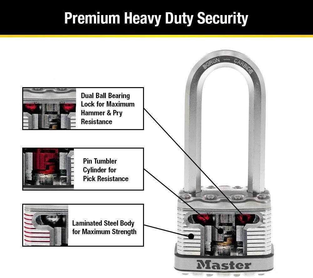 The Master Lock Magnum M5XTLJ Heavy Duty Stainless Steel Padlock with Key features a 2 in. (51 mm) wide laminated steel body for maximum strength and reliability, and is surrounded by stainless steel and zinc outer components for weather resistance. The 3/8 in. (10 mm) diameter octagonal shackle is 2-1/2 in. (64 mm) long and made of Tough-Cut boron-carbide, 50% harder than hardened steel, offering maximum resistance to cutting and sawing. The 4-pin cylinder prevents picking and the dual locking ball bearings provide maximum resistance against prying and hammering. The Lifetime Guarantee provides peace of mind from a brand you know and can trust.