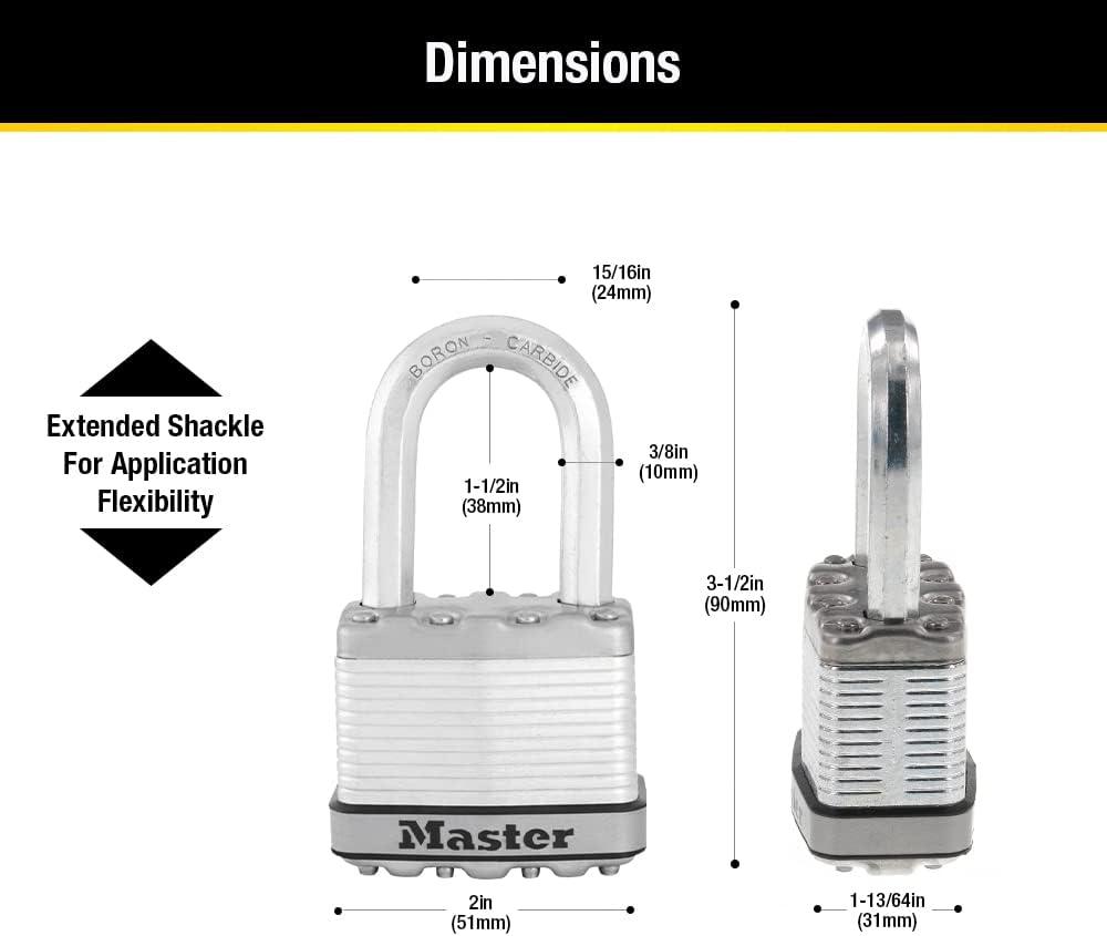 2 in. (51 mm) wide lock body; 3/8 in. (10 mm) diameter shackle with 1-1/2 in. (38 mm) length, 15/16 in. (24 mm) width; Extended shackle for application flexibility