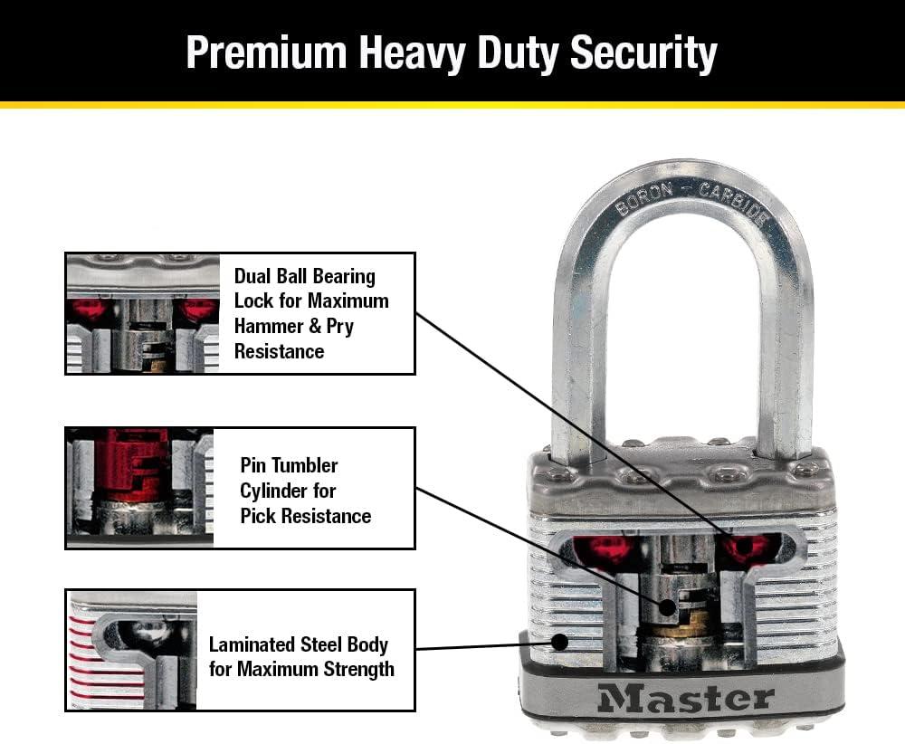 The Master Lock Magnum M5XTRILF Heavy Duty Laminated Padlock with Key features a 2 in. (51mm) wide laminated steel body for maximum strength and reliability, and is surrounded by stainless steel and zinc outer components for weather resistance. The 3/8 in. (10mm) diameter octagonal shackle is 1-1/2 in. (38mm) long and made of Tough-Cut boron-carbide, 50% harder than hardened steel, offering maximum resistance to cutting and sawing. The 4-pin cylinder prevents picking and the dual locking ball bearings provide maximum resistance against prying and hammering. The Lifetime Guarantee provides peace of mind from a brand you know and can trust.