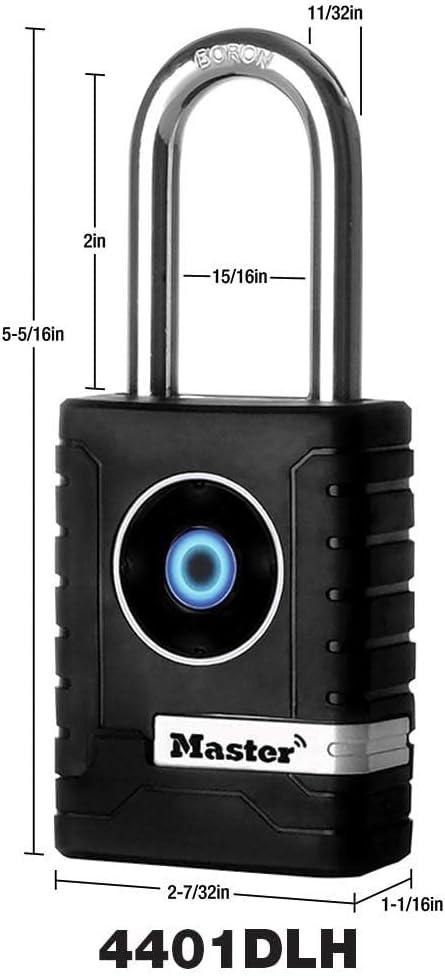 The Master Lock 4401DLH Bluetooth Padlock features a 2-7/32in (56mm) wide metal body for durability. The 11/32in (9mm) diameter shackle offers 2in (51mm) vertical clearance and is made of boron alloy, offering maximum resistance to cutting and sawing. The smartphone/app interface offers speed, ease of use, & greater control with the ability to share access, with keyless convenience. The locking mechanism features anti-shim technology, offering maximum security. The 1 Year Limited Warranty provides peace of mind from a brand you know and can trust.